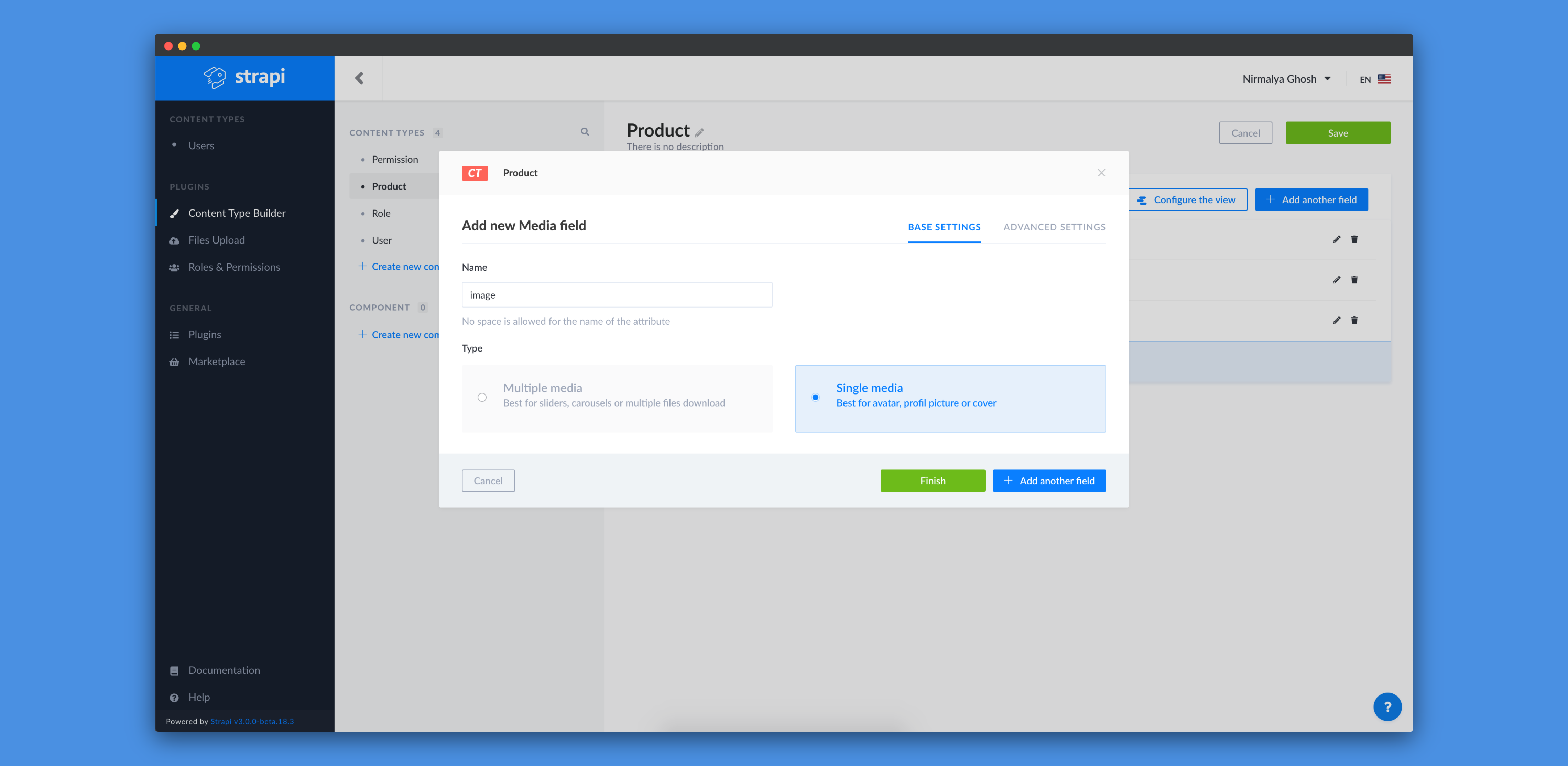 We'll add a Media field and call it image and select Single media as its type: