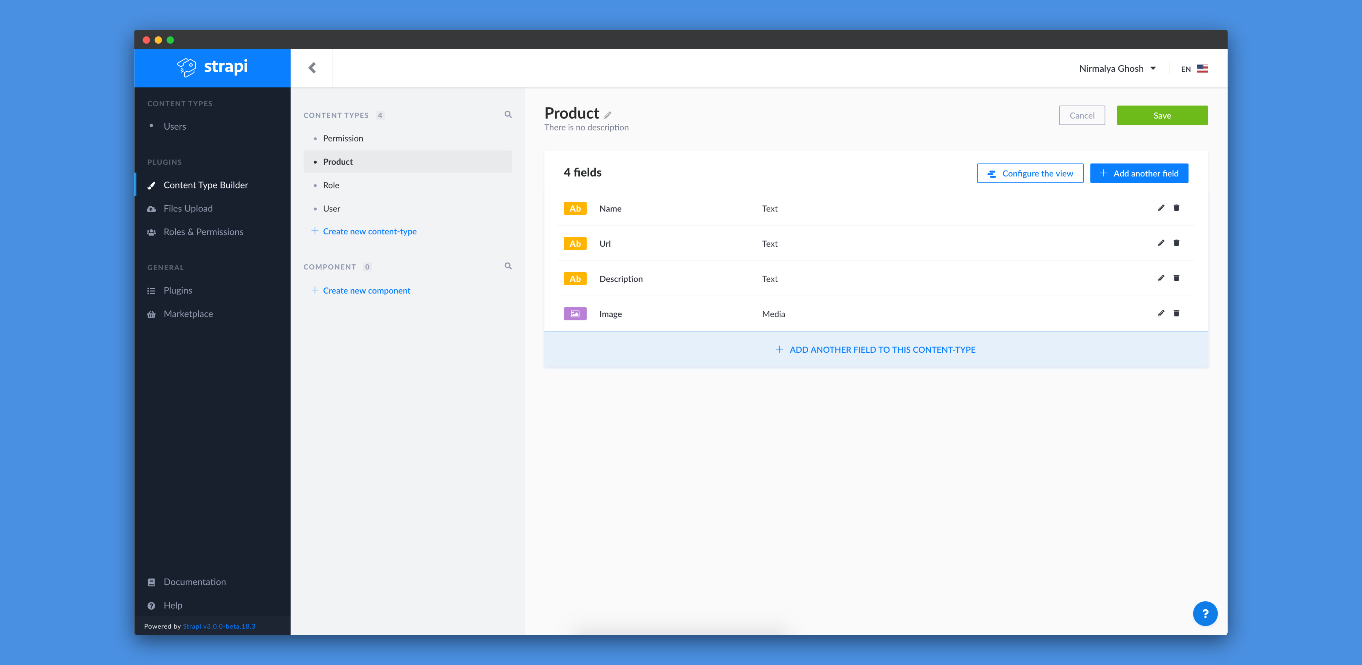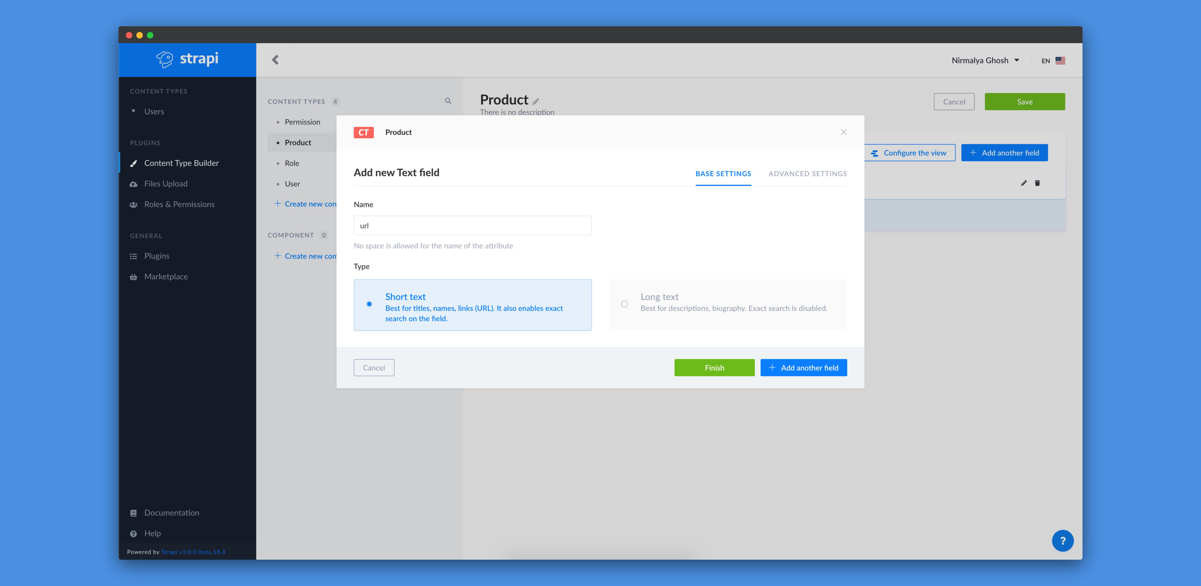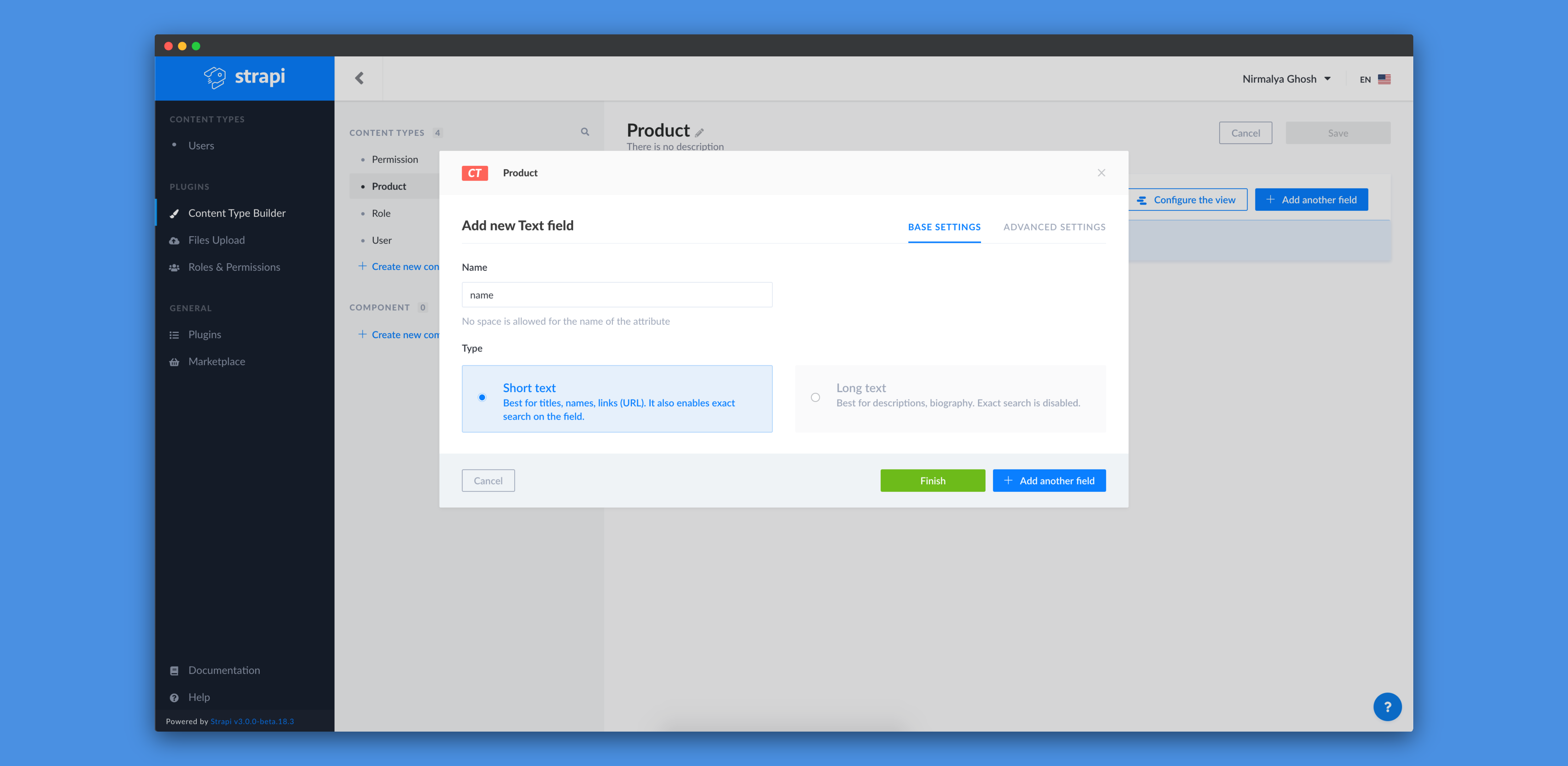We'll add a new Text field and call it name and select Short text as its type: