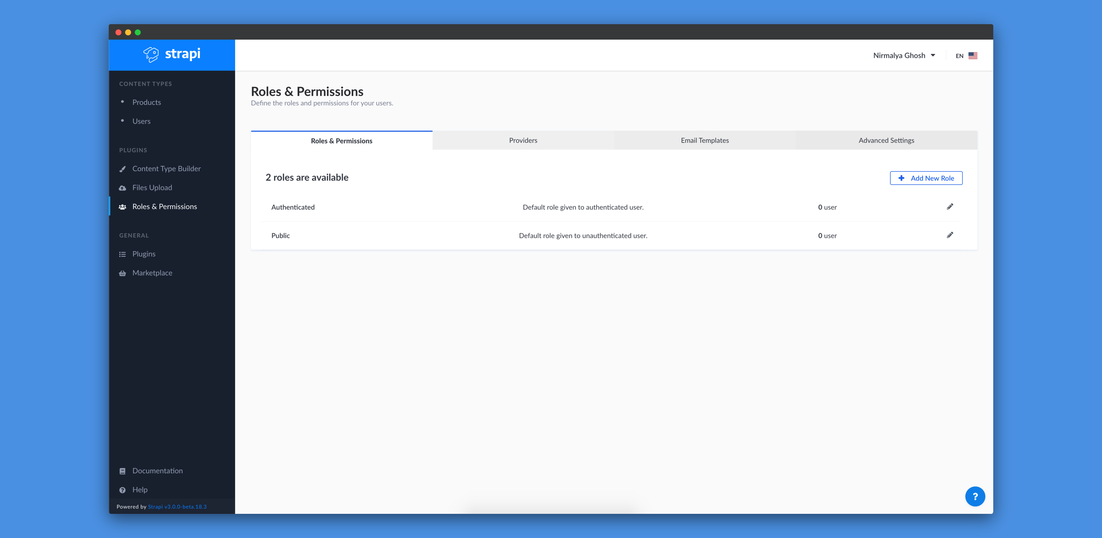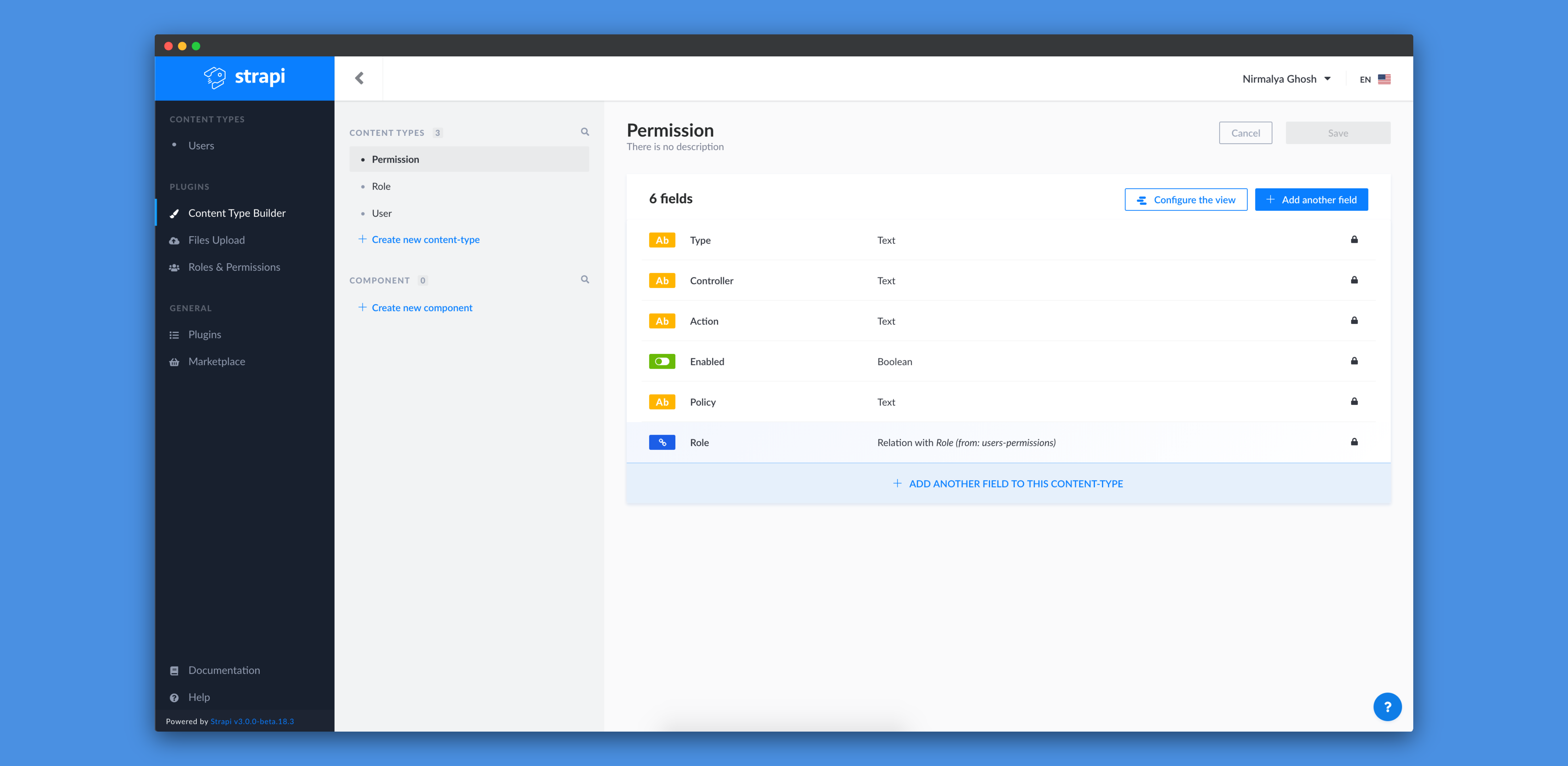 By default, we should have three content-types: Permission, Role and User.