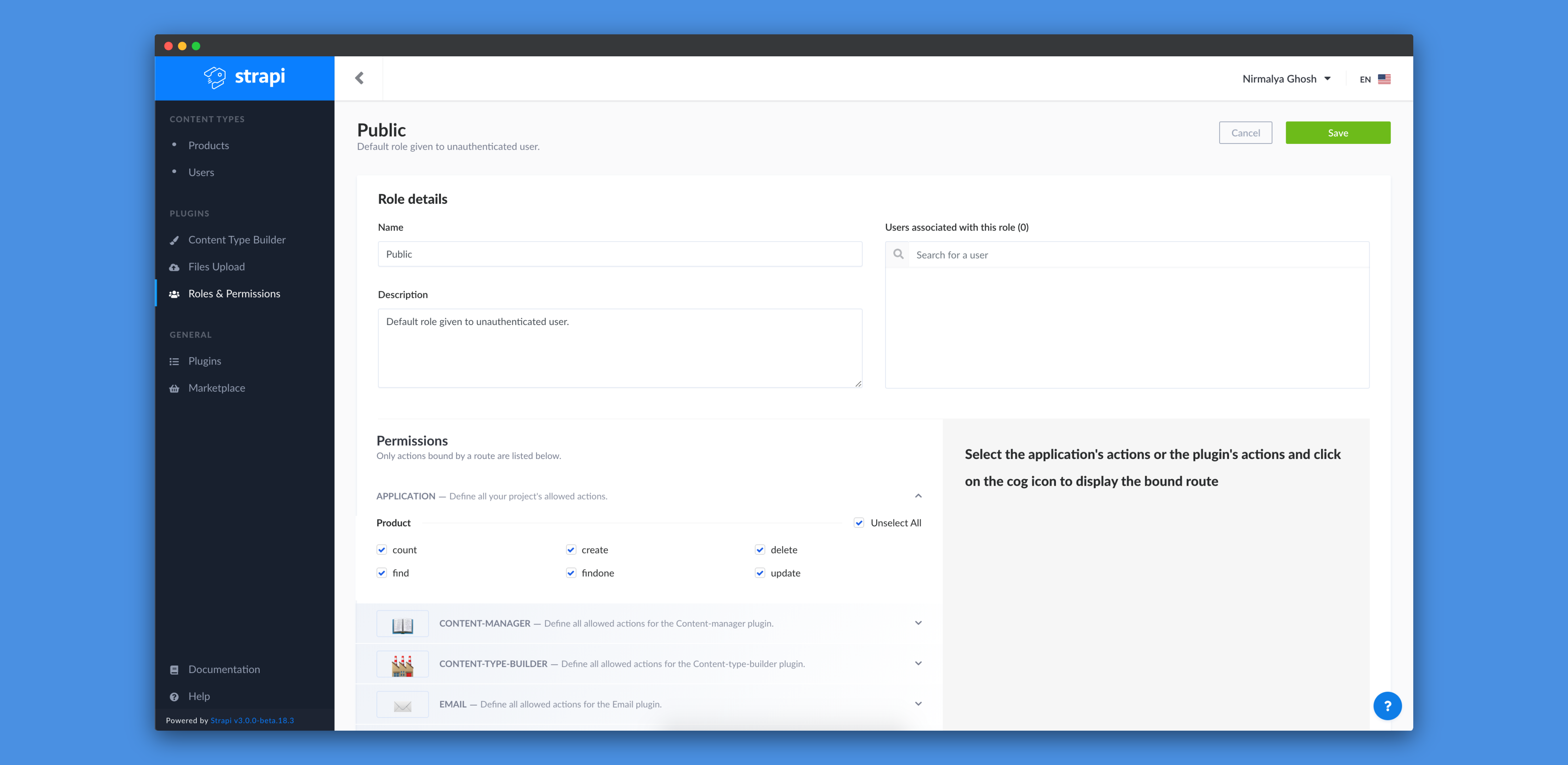 In the Public role tab, we need to find Product inside the Permissions tab. We need to allow all operations on the Product content-type. We can do so by selecting all the operations (count, create, delete, find, findone and update) or by clicking on Select All checkbox.