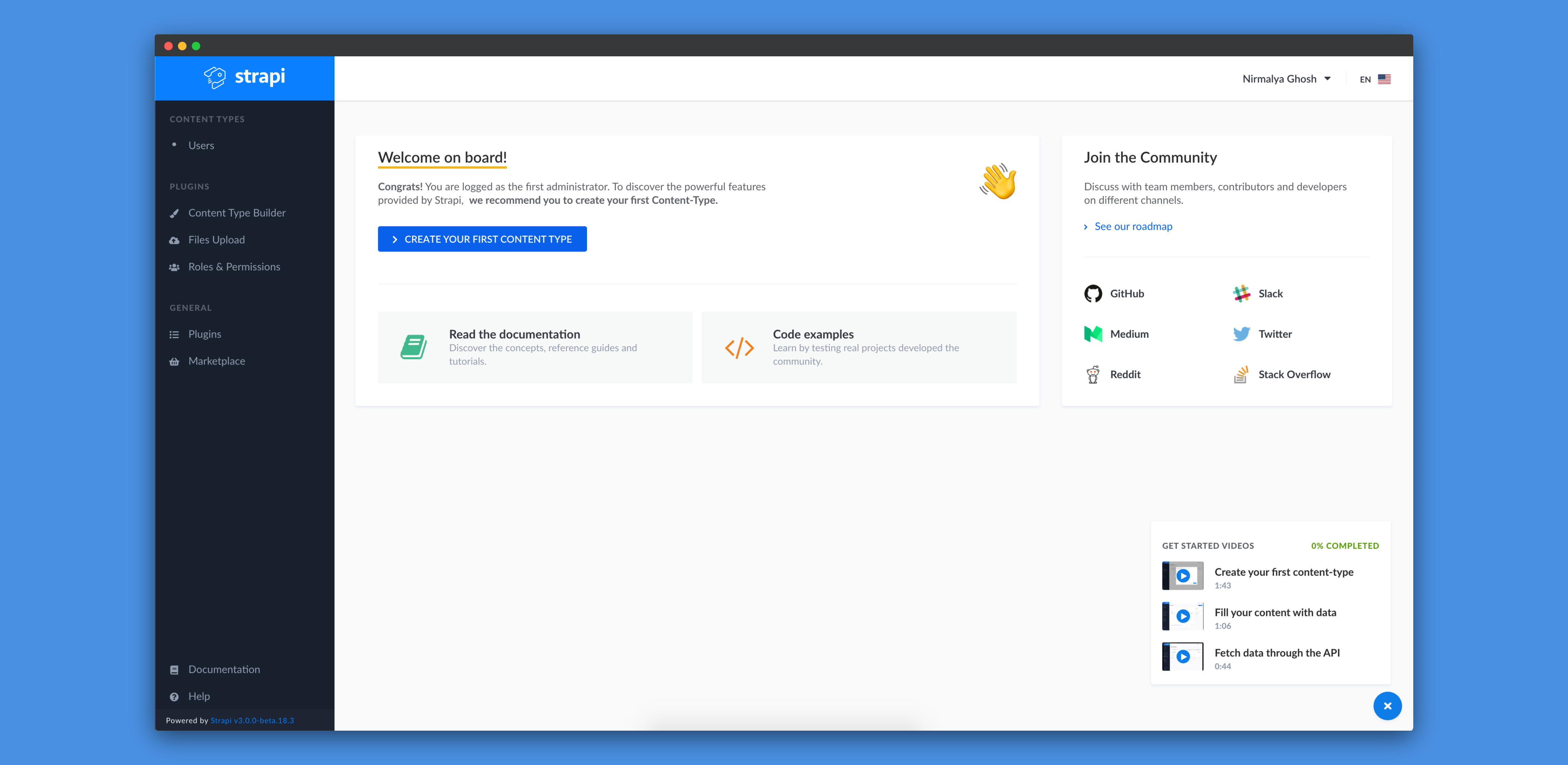 Once we fill up the form with the required details, we'll be inside the admin panel of Strapi:
