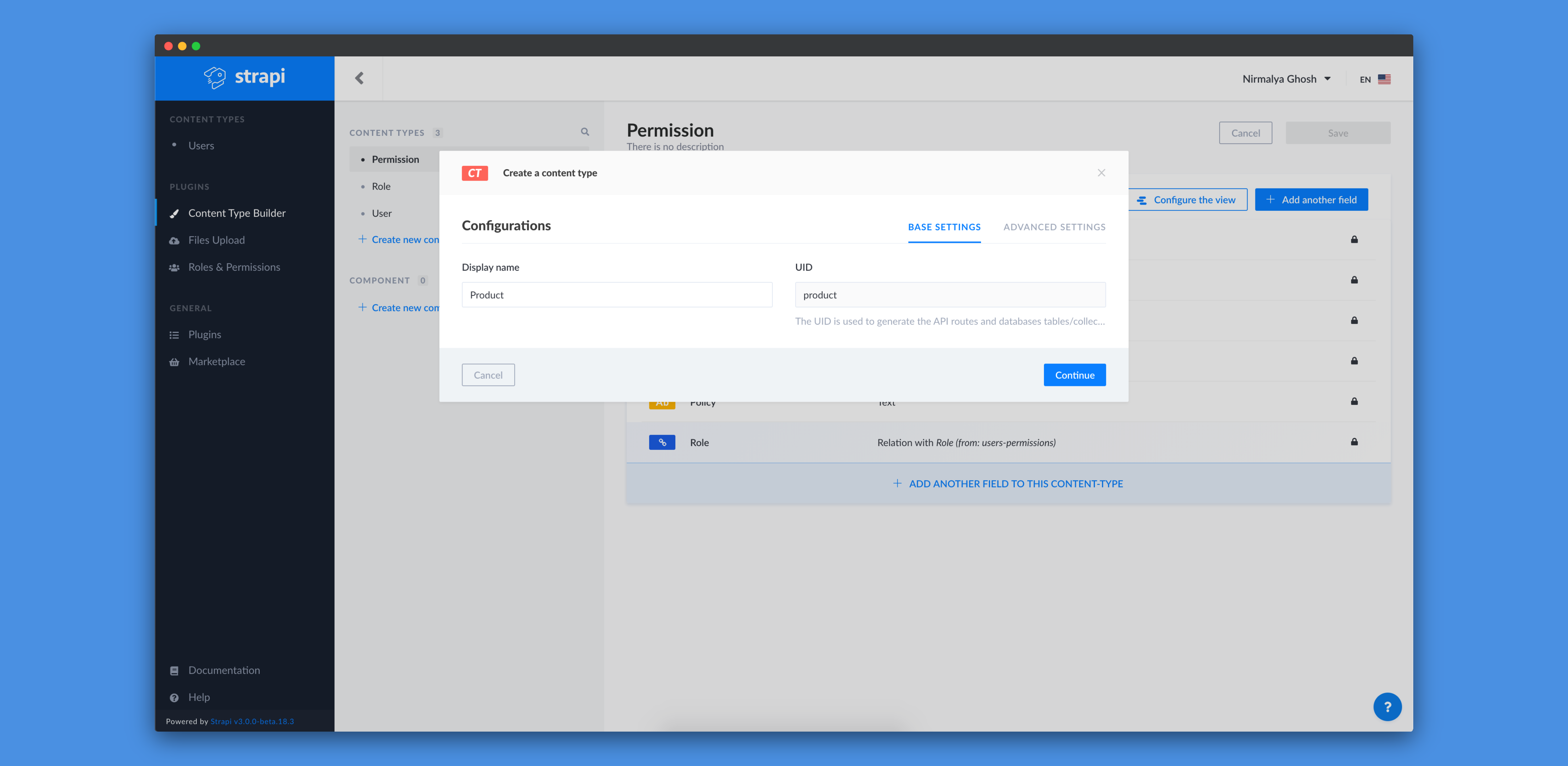 Then, we can click on Continue to add fields for that content-type:
